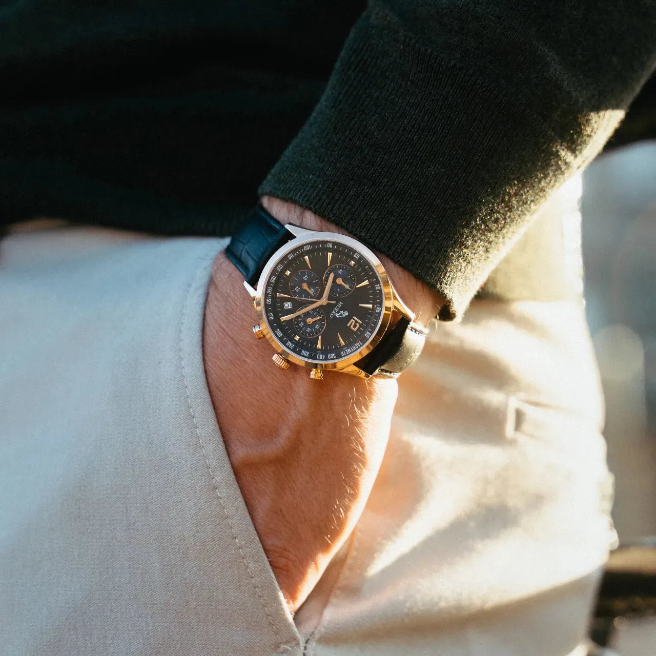 Chrono med mørkeblå urskive, rosa guld urkasse og sort krokodillerem